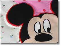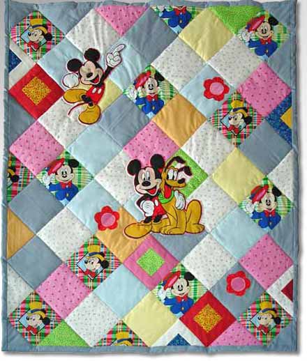 Hier kommt eine Kultfigur mit neuem Gesicht! Charmante Mäuse mit Hut und Zylinder, Mickey mit Pluto dem Hund, eine lustige Tanzmaus und dazu noch drei große rote flower- power Blumen. Die Decke ist ein Hingucker in jedem Kinderzimmer. Der Quilt ist diagonal genäht, die großen Figuren sind appliziert und mit der Hand plastisch aufgesteppt. Die Nähte wurden ebenfalls mit der Hand gequiltet, dadurch bleibt der Quilt wunderschön weich und erhält den Charakter einer kuscheligen Steppdecke.