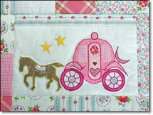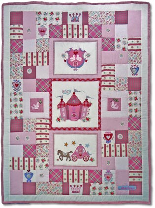 Für die beiden Decken und die Kissen habe ich Motive aus dem Märchen von "Dornröschen" entlehnt und in Stoffapplikationen umgesetzt. Neben dem großen Wappen, dem Traumschloß und der kleinen Pferdekutsche sind auf der großen Decke mehrere kleine Blümchenwappen, zwei Täubchen, eine Krone, ein Feenhut und zwei große applizierte Rosen zu entdecken. Auf der kleineren Decke steht Dörnröschen in der Deckenmitte und wird von zauberhaften Rosenstoffen eingefaßt. Alle Decken sind komplett mit der Hand durchgequiltet (Nähte). Die Kissen und der Teddy ergänzen die Kollektion. |